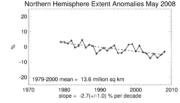 Southern Hemisphere (Antarctic) Sea Ice Extent Anomalies: Ice extent anomalies are plotted as a time series of percent differences between the total extent for the month in question, and the mean for that month, where the mean is based on the January 1979 - December 2000 portion of the data set. The trend, in percent change per decade, is obtained using least squares regression, and a 95% confidence interval for the resulting slope is given. |