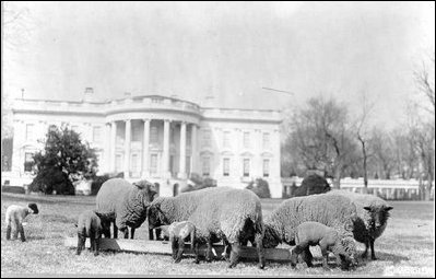 Sheep graze on the White House lawn during Woodrow Wilson's tenure. They were kept as part of the WWI war effort, "Conservation was the by word around the White House; eight sheep were soon gracing the lawns . . . many thousands of dollars were raised for the Red Cross through the auctioning of wool. Two pounds of wool were sold for each state when the sheep were fleeced of almost a hundred pounds of raw wool." - White House Maid and Seamstress Lillian Rogers Parks (My Thirty Years Backstairs at the White House, Fleet, 1961) |