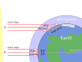 - the solar radiation arrives at an oblique angle nearer the poles, so that the energy spreads over a larger surface area, lessening its intensity.