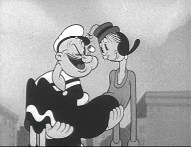 Popeye and Olive Oyl in A Date to Skate (1938). The film has fallen into the public domain, as its copyright was not renewed.