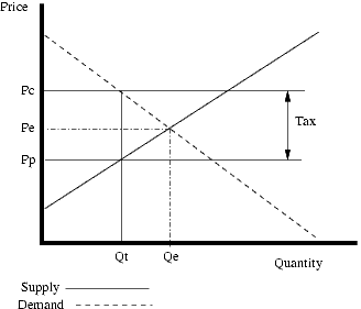 English: A diagram showing the effect of a per unit tax on the standard supply and demand diagram. Created by jrincayc for the purpose of illustrating the effect of taxes and subsidies on price.