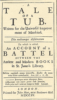 English: Title page of the en:1704 en:Tale of a Tub The page was set and produced by en:John Nutt, en:1704, and is in en:public domain. Scanned and given to public domain and free use by Geogre 01:00, 19 Oct 2004 (UTC). Reproduction is from an original.