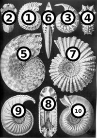 The 44th plate from Ernst Haeckel's Kunstformen der Natur of 1904, showing a collection of ammonites.