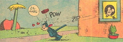 Detail of a Sunday page in which Ignatz, disguised as a painting, hurls a brick at Krazy Kat who interprets it as an expression of love.