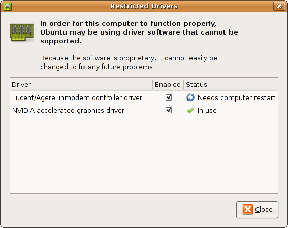Restricted-drivers manager in Ubuntu Feisty Fawn. |