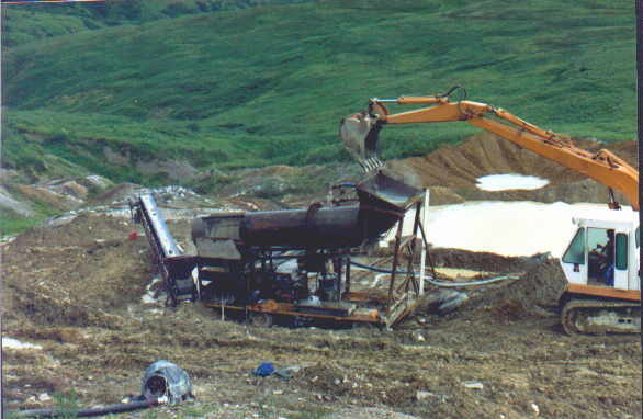 This is a photo of my trommel in operation at the Potato Patch, Blue Ribbon Mine, Alaska. The trommel is built using a piece of the Alaska Pipeline.