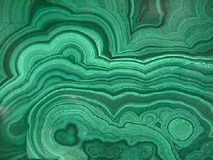 Photograph of a malachite specimen from Zaire taken by Dlloyd. Cut and polished section of botryoidal malachite.