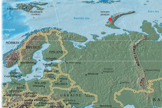 The place of explosion of the most powerful bomb in the history, Ivan: 73.85° N 54.50 E. Literature: