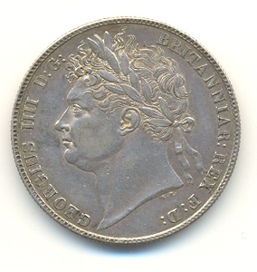Half-Crown of George IV, 1821. The inscription reads GEORGIUS IIII D G BRITANNIAR REX D G (George IV, by the Grace of God King of the Britons, Defender of the Faith). George IV was the last British King to be shown on coins wearing a Roman-style laurel wreath.