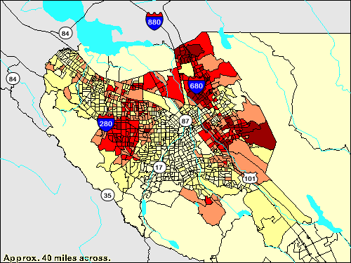 - 2005-04-12 06:20 Stevey7788 500×375×8 (22235 bytes) These '''thematic maps''' of the [[San Jose, California]] [[metropolitan area]] illustrate the different neighborhoods and the contrasting demographics of the diverse city. The San Jose East Side neighborhoods are the poorest, while the affluent western c