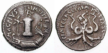 - It seems beyond doubt that this coin marks Pompey's "victory" over Octavian's fleet, which was mainly accomplished by an unfavorable wind that drove the latter's ships onto the rocks known as Scylleum near the harbour of Messina. Therefore the dates given for this issue in RSC and Crawford (42-40 BC) are wrong; the disaster at Messina occurred circa 38 BC.