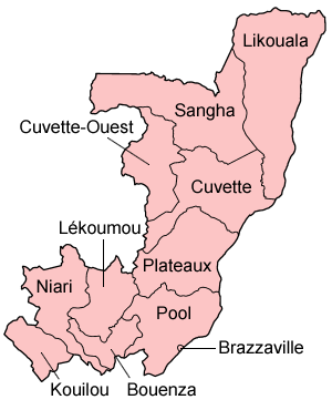 Map of the regions of the Republic of the Congo, named in French (local language), mostly compatible with English. The individual maps are: