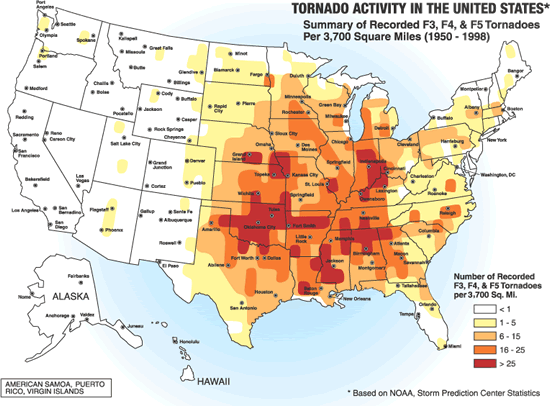 A map of the frequency of F3 and greater intensity tornadoes by area. The darker colors highlight the area typically known as Tornado Alley.