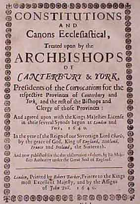 English: Title page of the Canons passed by the Convocation of the English Clergy at the behest of Charles I of England and William Laud and which imposed the Et Cetera Oath which was so distasteful to the Puritans
