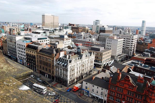 Leeds city panorama over looking the Headrow from the town hall clock tower. |