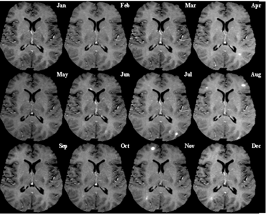 Multiple Sclerosis: T1-weighted MRI (post-contrast) of same brain slice at monthly intervals. Bright spots within the brain tissue indicate active lesions. |