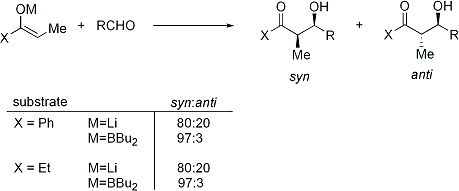 Since Z enolates must react through a transition state which either contains a destabilizing syn-pentane interaction or anti-Felkin rotamer, Z-enolates exhibit lower levels of diastereoselectivity in this case. Some examples are presented below: