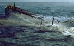 The Amoco Cadiz was a VLCC ( Very Large Crude Carrier), owned by Amoco, that split in two after running aground on Portsall Rocks, three miles off the coast of Brittany (France), on March 16, 1978, resulting at that time in the largest oil spill ever, currently the 5th-largest in history.