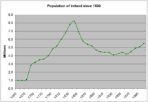 The population of England has risen steadily throughout its history, while the populations of Scotland and Wales have shown little increase during the twentieth century - the population of Scotland remaining unchanged since 1951. Ireland, which for most of its history comprised a population proportionate to its land area, one third of the total population, has since the Great Famine fallen to less than one tenth of the population of the British Isles. The famine, which caused a century-long population decline, drastically reduced the Irish population and permanently altered the demographic make-up of the British Isles. On a global scale this disaster led to the creation of an Irish diaspora that number fifteen times the current population of the island