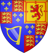 The official style of Charles II was "Charles the Second, by the Grace of God, King of England, Scotland, France and Ireland, Defender of the Faith, etc." (The claim to France was only nominal, and had been asserted by every English King since Edward III, regardless of the amount of French territory actually controlled.) His arms were: Quarterly, I and IV Grandquarterly, Azure three fleurs-de-lis Or (for France) and Gules three lions passant guardant in pale Or (for England); II Or a lion rampant within a tressure flory-counter-flory Gules (for Scotland); III Azure a harp Or stringed Argent (for Ireland).