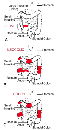 | The three most common sites of intestinal involvement in Crohn's disease are ileal, ileocolic and colonic. |