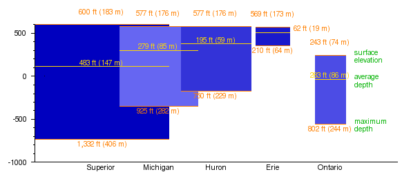 | Average depth | 62 ft (19 m) | 195 ft (59 m) | 279 ft (85 m) | 283 ft (86 m) | 483 ft (147 m) |