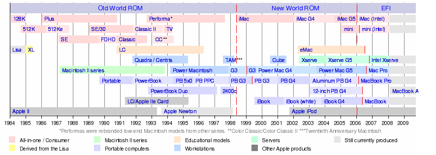 MacBook Pro![]() 15.4" or 17" models with aluminium casing; uses Intel Core 2 processors |