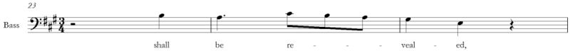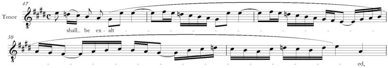 The notes climb to the high F♯ on the first syllable of mountain to drop an octave on the second syllable. The four notes on the word hill form a small hill, and the word low descends to the lowest note of the phrase. On crooked, the melody twice alternates between C♯ and B to rest on the B through the word straight. The word plain is written, for the most part, on the high E for three measures, with some minor deviation. He applies the same strategy throughout the repetition of the final phrase: the crookeds being crooked and plain descending down on three lengthy planes. He uses this technique frequently throughout the rest of the aria, specifically on the word exalted, which contains several sixteenth note (semiquaver) melismas and two leaps to a high E: