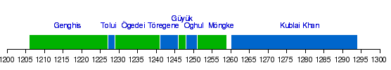 At first, the Mongol Empire was ruled by Ögedei Khan, Genghis Khan's third son and designated heir, but after his death in 1241, the fractures which would ultimately crack the Empire began to show. Enmity between the grandchildren of Genghis Khan resulted in a five year regency by Ögedei's widow until she finally got her son Guyuk Khan confirmed as Great Khan. But he only ruled two years, and following his death -- he was on his way to confront his cousin Batu Khan, who had never accepted his authority -- another regency followed, until finally a period of stability came with the reign of Mongke Khan, from 1251-1259. The last universally accepted Great Khan was his brother Arigboh (aka. Arigbuga, or Arigbuha), his elder brother Kublai Khan dethroned him with his own supporters after some extensive battles. Kublai Khan ruled from 1260-1294. Despite his recognition as Great Khan, he was unable to keep his brother Hulagu and their cousin Berke from open warfare in 1263, and after Kublai's death there was not an accepted Great Khan, so the Mongol Empire was fragmented for good.