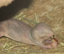 The naked mole rat (Heterocephalus glaber), also known as the sand puppy, or desert mole rat is a burrowing rodent native to parts of East Africa and the only species currently classified in genus Heterocephalus. It is notable for its eusocial lifestyle, nearly unique among mammals (only the Damaraland mole rat shares the trait), and for a highly unusual set of physical traits that enables it to thrive in a harsh, underground environment; including a lack of pain sensation in its skin, and a nearly cold-blooded metabolism.