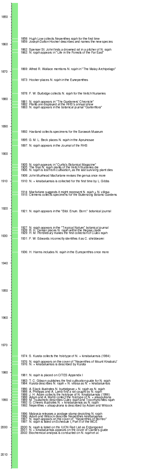 N. rajah was first collected for the Veitch Nurseries by Frederick William Burbidge in 1878, during his second trip to Borneo. Shortly after being introduced into cultivation in 1881, N. rajah proved very popular among wealthy Victorian horticulturalists and became a much sought-after species. A note in The Gardeners' Chronicle of 1881 mentions the Veitch plant as follows: "N. rajah at present is only a young Rajah, what it will become was lately illustrated in our columns...". A year later, young N. rajah plants were displayed at the Royal Horticultural Society's annual show for the first time. The specimen exhibited at the show by the Veitch Nurseries, the first of this species to be cultivated in Europe, won a first class certificate. In Veitch's catalogue for 1889, N. rajah was priced at £2.2 s per plant. During this time, interest in Nepenthes had reached its peak. The Garden reported that Nepenthes were being propagated by the thousands to keep up with European demand.