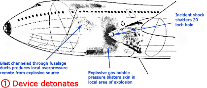 The fuselage of the aircraft was reconstructed by air accident investigators, revealing a 20-inch (510 mm) hole consistent with an explosion in the forward cargo hold. Examination of the baggage containers revealed that the container nearest the hole had blackening, pitting, and severe damage indicating a "high-energy event" had taken place inside it. A series of test explosions were carried out to confirm the precise location and quantity of explosive used.