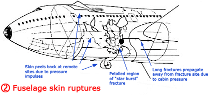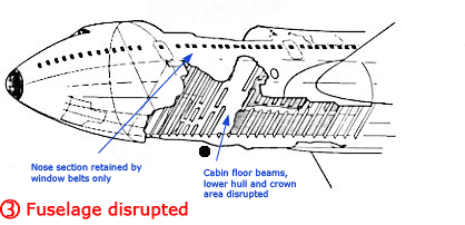 The power of the explosion was increased by the difference in air pressure between the inside of the aircraft, where it was kept at breathable levels, and outside, where it was about a quarter of that at sea level. The nose of the aircraft, containing the flight crew and the first class section, broke away, striking the No. 3 Pratt & Whitney engine as it snapped off.