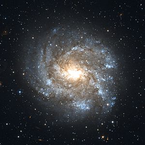 The image is omposite of several shots taken by Hubble Space Telescope on September 11, 2002 using ACS instrument with 435 nm (blue) and 814 nm (red) wavelength filters. Colour image processed by WikiSky team.