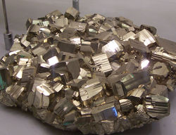 The mineral pyrite, or iron pyrite, is an iron sulfide with the formula FeS2. This mineral's metallic luster and pale-to-normal, brass-yellow hue have earned it the nickname fool's gold due to its resemblance to gold. Pyrite is the most common of the sulfide minerals. The name pyrite is derived from the Greek πυρίτης (puritēs), “of fire” or "in fire”, from πύρ (pur), “fire”. This name is likely due to the sparks that result when pyrite is struck against steel or flint. This property made pyrite popular for use in early firearms such as the wheellock.