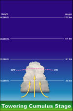 The first stage of a thunderstorm is the cumulus stage, or developing stage. In this stage, masses of moisture are lifted upwards into the atmosphere. The trigger for this lift can be insolation heating the ground producing thermals, areas where two winds converge forcing air upwards, or where winds blow over terrain of increasing elevation. The moisture rapidly cools into liquid drops of water, which appears as cumulus clouds. As the water vapor condenses into liquid, latent heat is released which warms the air, causing it to become less dense than the surrounding dry air. The air tends to rise in an updraft through the process of convection (hence the term convective precipitation). This creates a low-pressure zone beneath the forming thunderstorm. In a typical thunderstorm, some 5×108 kg of water vapour are lifted, and the amount of energy released when this condenses is about equal to the energy used by a city (US-2002) of 100,000 during a month.