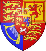 His arms were:- Quarterly, I and IV Gules three lions passant guardant in pale Or (for England); II Or a lion rampant within a tressure flory-counter-flory Gules (for Scotland); III Azure a harp Or stringed Argent (for Ireland); overall an escutcheon tierced per pale and per chevron (for Hanover), I Gules two lions passant guardant Or (for Brunswick), II Or a semy of hearts Gules a lion rampant Azure (for Lüneburg), III Gules a horse courant Argent (for Westfalen), the whole inescutcheon surmounted by a crown.