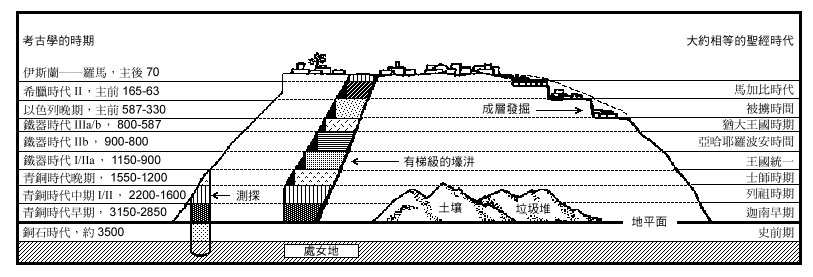 一个古巴勒斯坦遗址的概略图,显示出发挖的方法和有人居住的地层(也见“