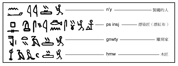 古埃及不同职业的名称,前排是象形文字,后排是音译。
