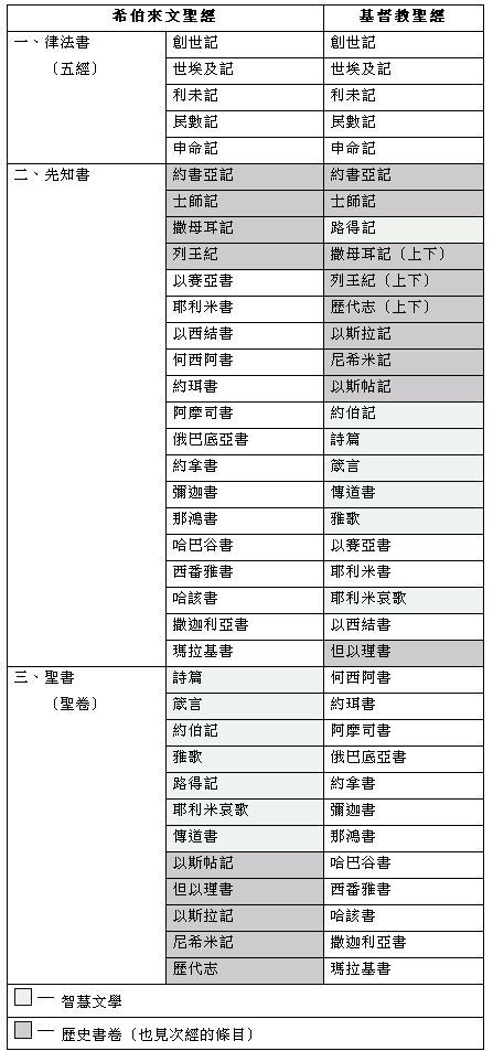 表 基督教传统的旧约书卷正典的编排与希伯来文圣经原来的次序比较
