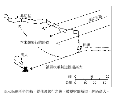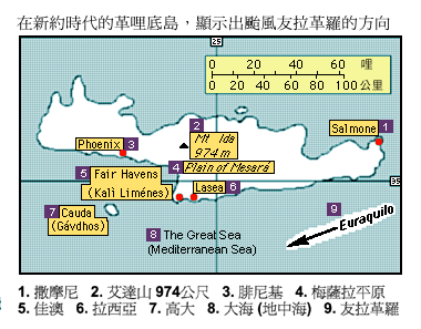 图 图示新约时代台风友拉的方向及保罗所坐的船被该台风吹离航道