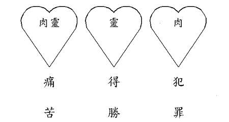一切善的感動,都是從上而來,聖靈在我們靈裏說話。反之,一切惡的意思,都由身體而入,魔鬼借人的肉體入到人的魂裏,使人裏面起了大的衝突。保羅在羅馬七章嘗述說這種衝突和痛苦。最後他說:「我真是若啊!誰能救我脫離這取死的身體呢?」但其後保羅已明白這個道理,在加拉太五章可以見到。羅馬八章十二,十三節他亦明白宣布說:「弟兄們,這樣看來,我們並不是欠肉體的債,去順從肉體活。你們若順從肉體活必要死,若靠聖靈治死身體的惡行必要活。」羅馬六至八章這個靈歷的演進,我們若不明白,是為最大的虧損。羅馬一至五章論救恩,六至八章論戰爭。六章是論戰爭得勝的原理,七章是論戰爭失敗的經驗,八章是論靠主得勝的經驗。保羅能把肉體掛在十字架之上,故能天天過得勝的生活。