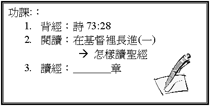 *注意:若該次靈修沒什麼領受,也不要太介懷,因只要能親近神,也是一件快樂的事。