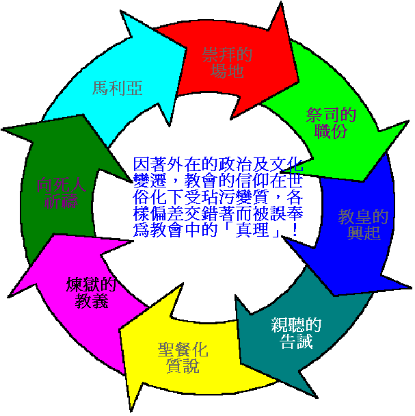 | 以上的因素集而成的教皇體系,從主後四五一年迦克墩會議被題出,在主後七五二年開始與政治更深的交錯,使其屬靈及屬世權力一時間達至巔峰,後因羅馬帝國沒落而稍減。但主後一八七零年更加入教皇無誤論,將其權力更推上一層樓。 | |||||||||