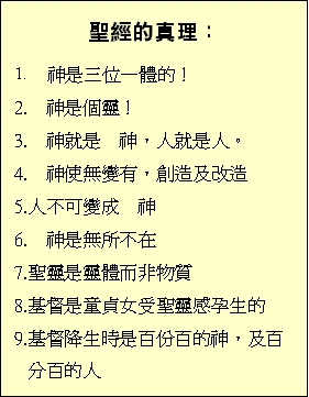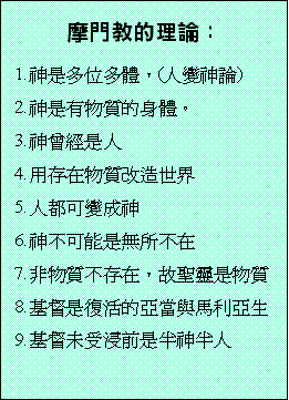 摩門教在教義約一書中,以父神及主耶穌是有可以摸的骨肉身體,聖靈是沒有骨肉的身體......並所有的靈都是物質,又妄用聖經林前八:5 的話而強稱有許多的神。並且摩門教又以神是要先存的靈,經在地上得著肉身而得以進化為更高級的位置及可以享受到不同等級的天堂快樂。從而引進「人的進化為神」的概念,又妄用聖經創三:5 的話作根據。
