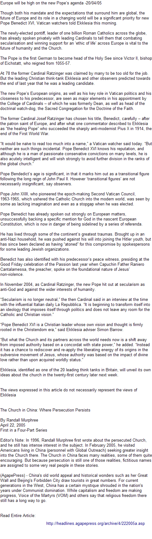 New Pope promises unity and reform -20/04/05 In his first major message to the world Pope Benedict XVI today pledged to work to unify Christians, to reach out to other religions, and to continue implementing reforms from the Second Vatican Council. The Pope made it clear that his pontificate would closely follow the trajectory of his predecessor, Pope John Paul II. Benedict, the former Cardinal Joseph Ratzinger, listed top priorities of his papacy in a message read in Latin to cardinals gathered in the Sistine Chapel for the first Mass celebrated by the 265th leader of the Roman Catholic Church, reports AP. He said his "primary task" would be to work without fail to reunify all Christians and that sentiment alone was not enough. "Concrete acts that enter souls and move consciences are needed," he declared. The new Pope also said that he wanted to continue "an open and sincere dialogue" with other religions and would do everything in his power to improve the ecumenical cause. The message was clearly designed to show that Benedict was intent on following many of the more groundbreaking paths charted by John Paul, who had made reaching out to other religions and trying to heal the 1,000-year-old schism in Christianity a hallmark of his pontificate. But the new Pope, like his predecessor, sees unity as being achieved through the centrality of his office and the prior claims to authenticity of the Roman Catholic Church, said commentators responding to Bendedict's message. The Pope referred to his predecessor several times in his message, including a reference to the late pope's final will, where John Paul said he hoped new generations would draw on the work of the Second Vatican Council, the 1962-65 meeting that modernized the church. "I too ... want to affirm with decisive willingness to follow in the commitment of carrying out the Second Vatican Council, in the wake of my predecessors and in faithful continuity with the 2,000-year-old tradition of the church," said Benedict. John Paul, with Benedict as his doctrinal enforcer, supported council reforms but cracked down on what both men considered excesses spawned by the changes, including calls for priests to be allowed to marry and admission of women into the priesthood. The Vatican's hard-line enforcer of church orthodoxy under John Paul for almost 25 years, Benedict had gone into the two-day conclave as one of the favorites to be chosen as pope. He emerged Tuesday as the oldest pontiff at the time of his election in 275 years and the first Germanic pope in almost a millennium. A wildly cheering crowd of more than 100,000 welcomed Benedict when he stepped onto the balcony of St Peter's Basilica as dusk fell yesterday and gave his first blessing as Pope. Some pilgrims on St Peter's Square hugged their neighbors and jumped in joy. Others wept in disappointment. The views expressed in this article do not necessarily represent the views of Ekklesia |