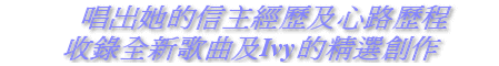 介紹: "一 家 歸 主" 是 Ivy 的 一 個 心 願 ,『用 愛 復 和』- 是 她 家 庭 改 變 的 寫 照 。 Ivy 自 少 生 長 於 單 親 家 庭 , 與 父 親 關 係 惡 劣 , 但 自 從 Ivy 信 主 之 後 , 她 因 著 神 的 話 語 而 得 著 改 變 , 以 神 的 愛 去 愛 她 的 父 親 , 多 年 來 為 他 祈 禱 , 希 望 他 能 信 主 。 終 於 十 年 後 她 全 家 都 歸 信 主 耶 穌 , 見 證 了 神 的 信 實 ! 『用愛復和』 由 Ivy 親 自 填 詞 , 並 以 舒 情 的 唱 腔 、 悅 耳 的 歌 聲 和 投 入 的 演 繹 唱 出 自 己 的 心 聲 , 並 由 資 深 基 督 教 音 樂 人 Larry Hung 作 曲 及 編 曲 , 令 歌 曲 生 色 不 少 。 相 信 喜 歡 Ivy 的 聽 眾 一 定 不 會 失 望 , 還 會 很 期 待 Ivy 第 二 張 大 碟 『這樣才是愛』 的 其 他 歌 曲 呢 !