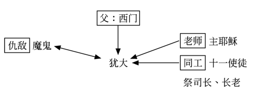 名称:本名犹大(Juda)。在中文圣经中被称为犹大的,旧约有八位,新约有六位。为了区别,这位犹大通常按其出生地,被称为“加略人犹大”,或“卖主的犹大”。主耶稣曾称他为“魔鬼”(约六71)及“灭亡之子”(约十七12)。使徒约翰称他为“贼”(约十六6)。2.