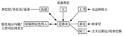 人物(Who)──上司:波斯亚达薛西王一世(亚哈随鲁──薛西王之子,可能是以斯帖的继子)。亲友:父──哈迦利亚(字意:要等待耶和华),弟兄──哈拿尼(字意:耶和华有恩慈)。同工:文士以斯拉(亚撒利亚之简称,字意:耶和华帮助),哈拿尼雅(尼七2),旧约最后先知玛拉基可能在同时代。软弱的以色列人:假先知示玛雅(尼六10,11),大祭司以利亚实(尼十三28)。仇敌:撒玛利亚省长和仑人参巴拉、亚扪省长“为奴的亚扪人”多比亚,阿拉伯人基善。3.