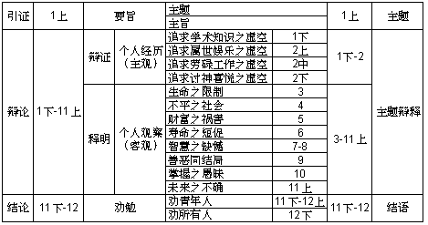 6. (3) 福禄寿贫皆必一死 7. (4) 恶人当道 8. (5) 善恶之结局 9. (6) 死亡结束一切 10. (7) 智愚喻邦国 11. (8) 积蓄喻听训 12. 忠劝与结论 |